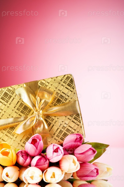 Желтая подарочная коробка и букет тюльпанов на розовом фоне