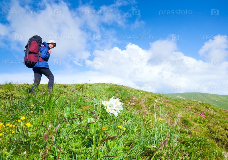 Туристка в горах летом