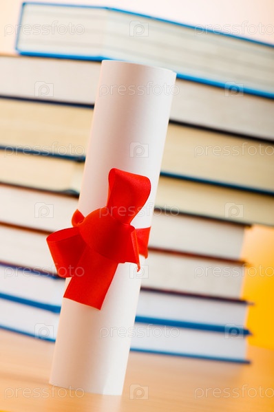 Диплом с красной лентой и стопка книг на деревянном полированном столе
