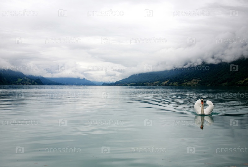 Белый лебедь плывет по озеру