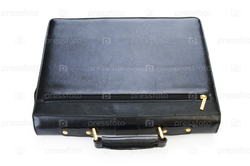 Черный кожаный портфель лежит на белом фоне