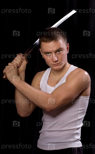 Молодой человек с мечом на черном фоне