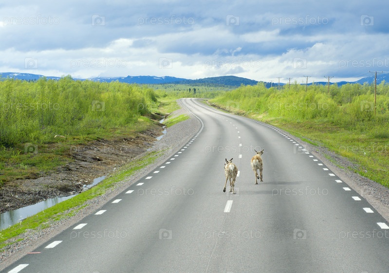 Олени бегут по асфальтовой дороге в Лапландии