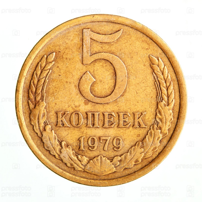 Старая советская монета достоинством в пять копеек, изолирована на белом фоне