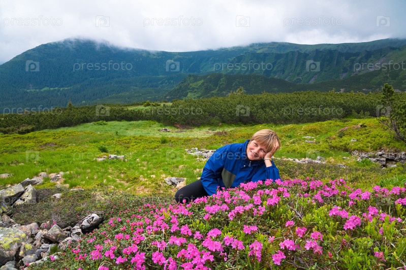 Розовые цветы рододендрона и счастливая женщина в летних горах (Украина, Карпаты)