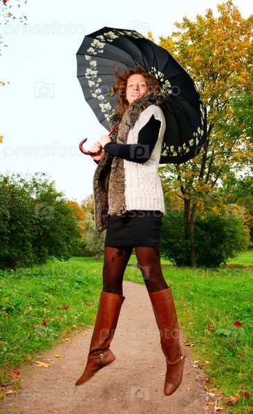 Девушка с зонтиком в прыжке