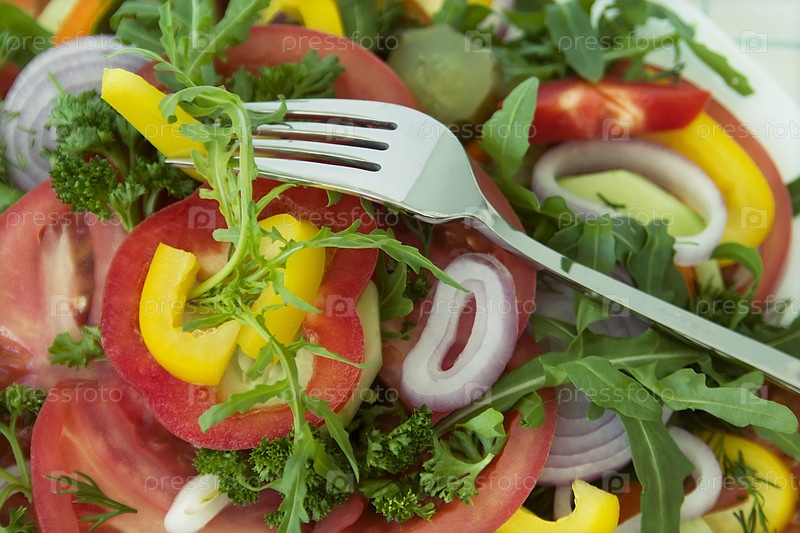 Салат с помидорами, огурцами, белым сыром, черными маслинами и петрушкой на стеклянной тарелке , вилка, стакан воды на скатерти