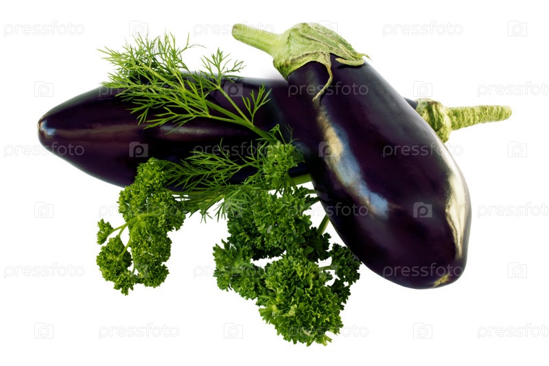 Два баклажана с петрушкой и укропом, изолированные на белом фоне