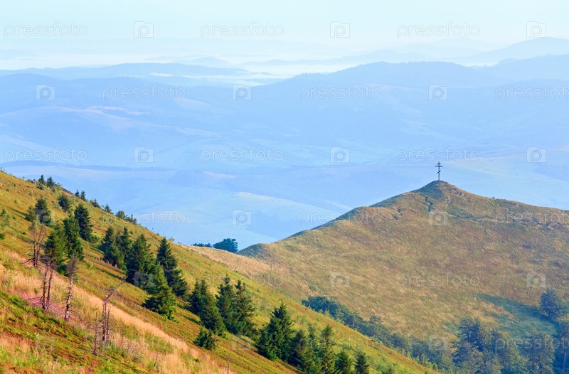 Горный пейзаж с христианским крестом на вершине холма. Карпаты, Украина