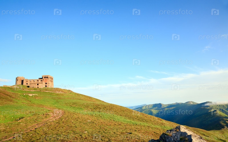 Горный пейзаж с разрушенной крепостью на вершине холма. Карпаты, Украина