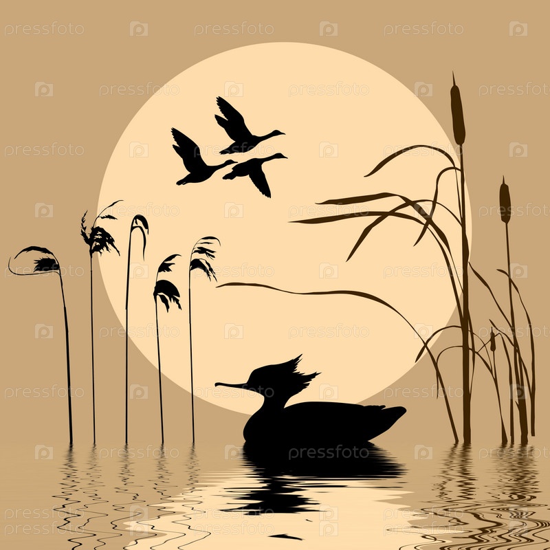 Силуэты водоплавающих птиц на пруду на бежевом фоне