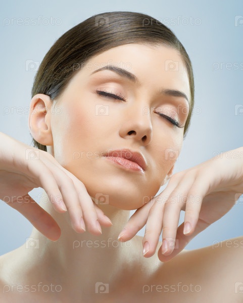 Портрет красивой брюнетки на голубом фоне