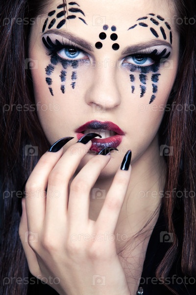 Портрет девушки с нарисованным пауком на лице и черными ногтями