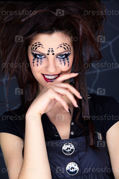 Портрет девушки с нарисованным пауком на лице и черными ногтями на фоне паутины