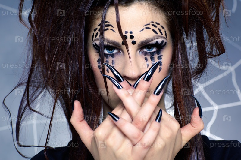 Портрет девушки с нарисованным пауком на лице и черными ногтями на фоне паутины