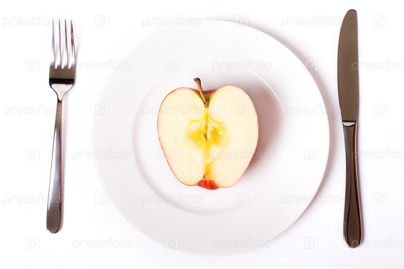 Красное яблоко на белой тарелке с ножом и вилкой