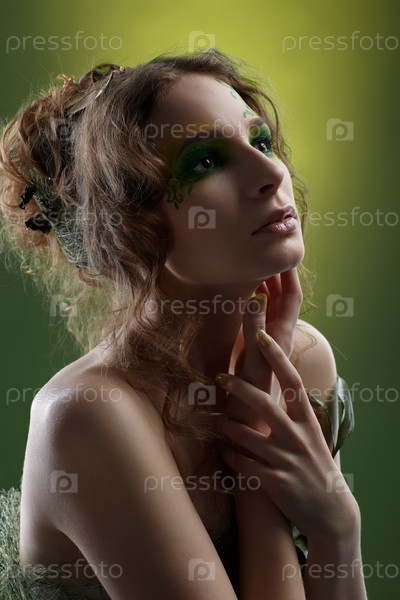 Портрет красивой девушки с ярким макияжем в платье из листьев