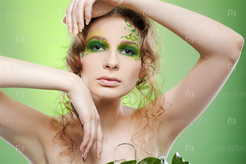 Портрет красивой девушки с ярким макияжем в платье из листьев