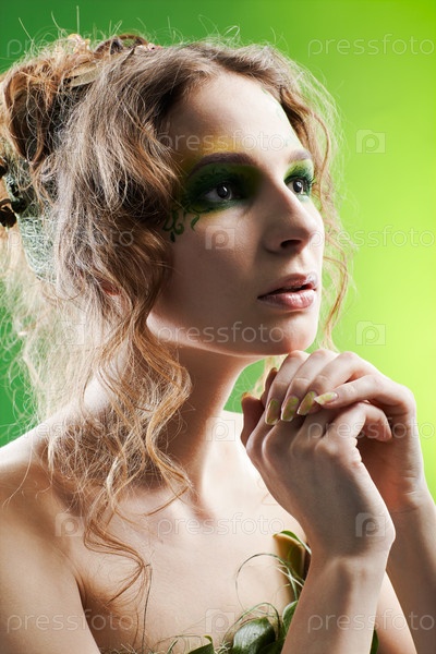 Портрет красивой девушки с ярким макияжем в платье из листьев