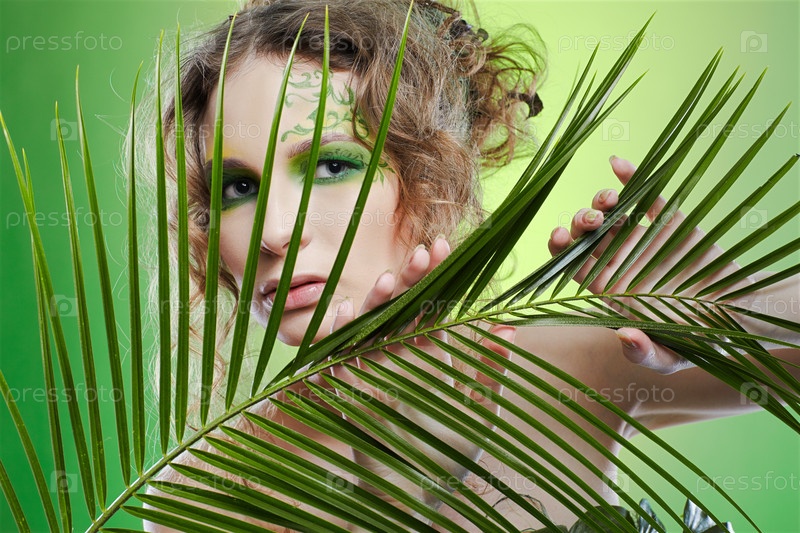 Красивая девушка с ярким макияжем в платье из листьев позирует с листом папоротника