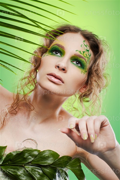 Красивая девушка с ярким макияжем в платье из листьев позирует с листом папоротника