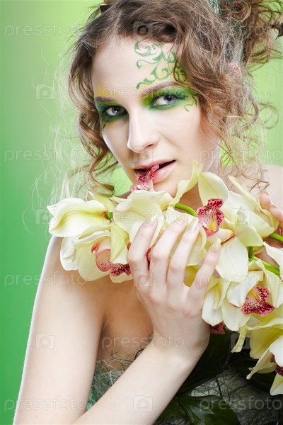 Красивая девушка с ярким макияжем в платье из листьев позирует с орхидеей