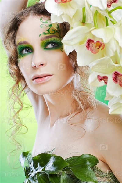 Красивая девушка с ярким макияжем в платье из листьев позирует с орхидеей