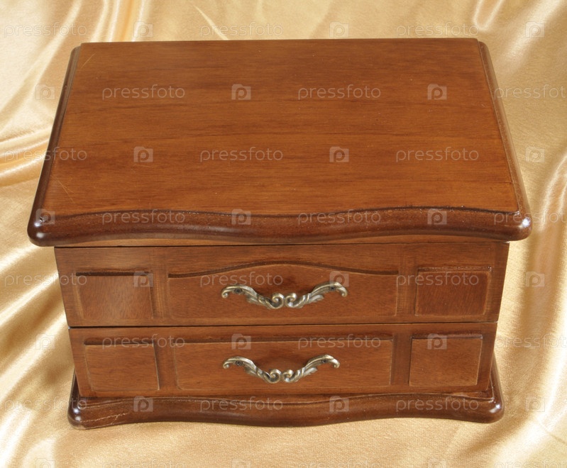 Близкий план деревянной коробки для хранения ценностей на фоне ткани
