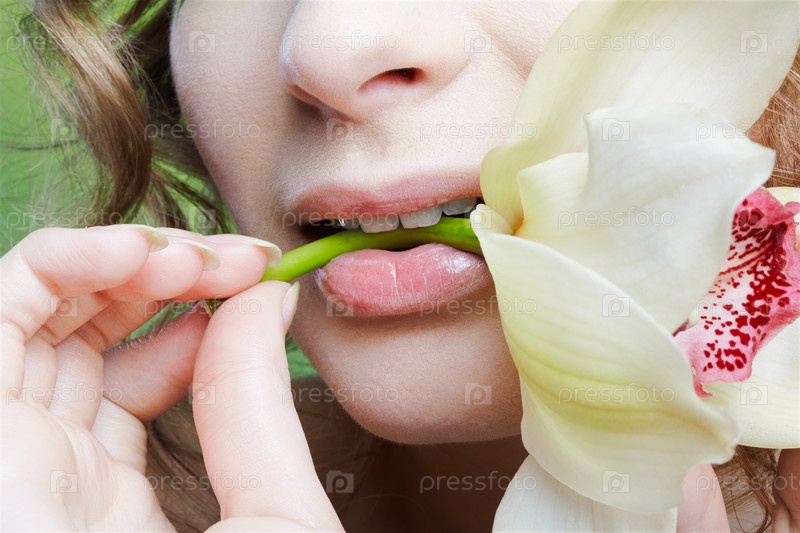 Красивая девушка с орхидеей в зубах