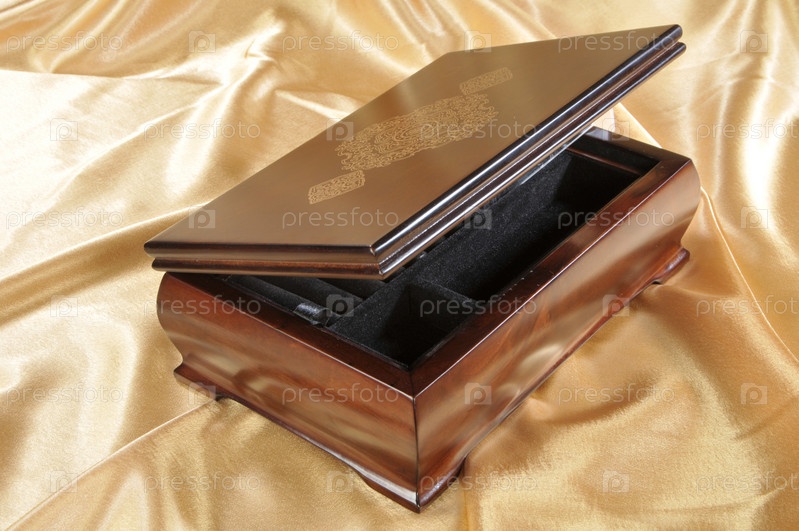 Близкий план деревянной коробки для хранения ценностей на фоне ткани