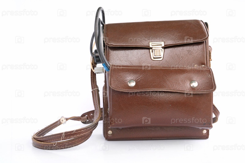Старая коричневая сумка с аккумулятором для фотовспышки, на белом фоне