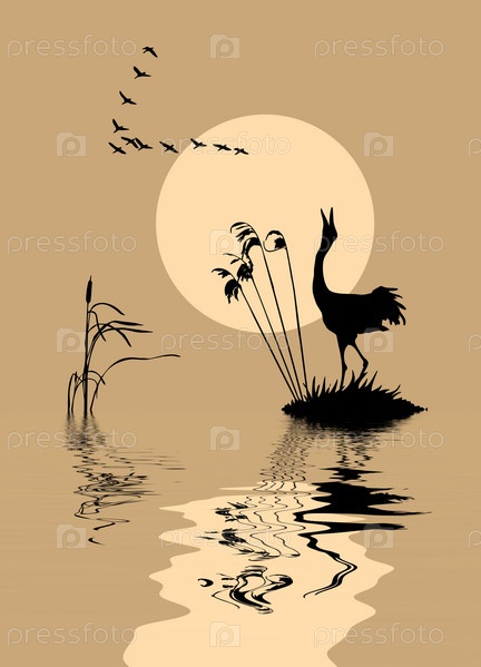 Векторный силуэт летящих журавлей на фоне солнца