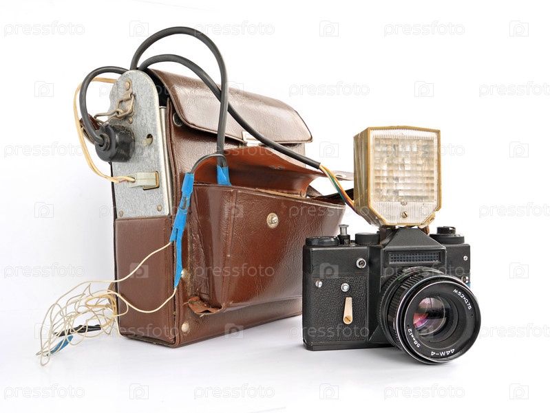 Старая фотокамера со вспышкой и коричневая сумка с аккумулятором для фотовспышки