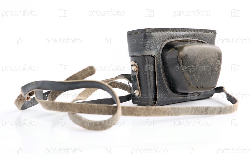 Старый чехол для фотоаппарата на белом фоне