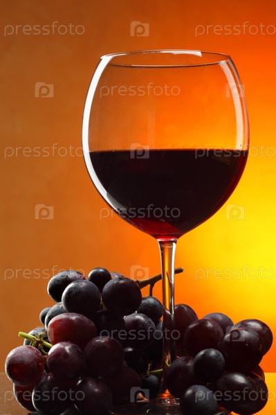 Натюрморт с красным вином и гроздью винограда