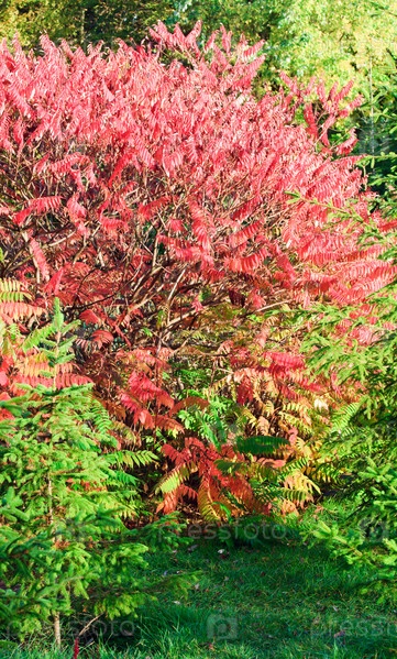 Красивый красный куст и небольшие деревья пихты в осеннем парке