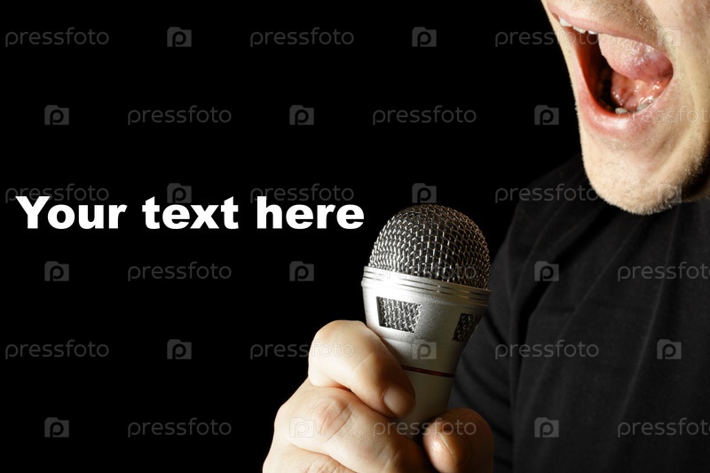 Певец с микрофоном крупным планом на черном фоне