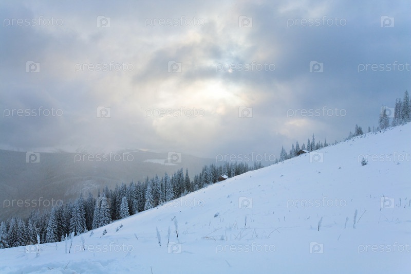 Заснеженные елки на горном склоне на фоне пасмурного неба