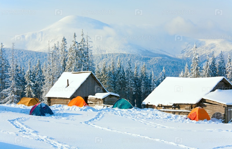 Старые деревянные домики и туристические палатки в Карпатских горах зимой