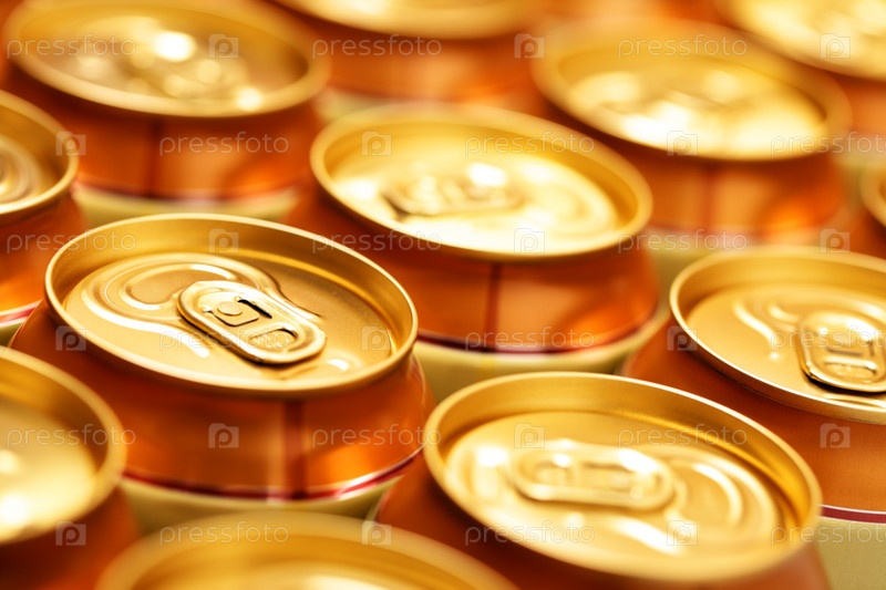 Золотистые банки с пивом, макро