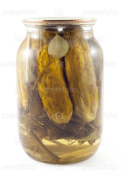 Банка соленых огурцов на белом фоне