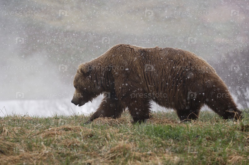 Бурый медведь идет под снегопадом