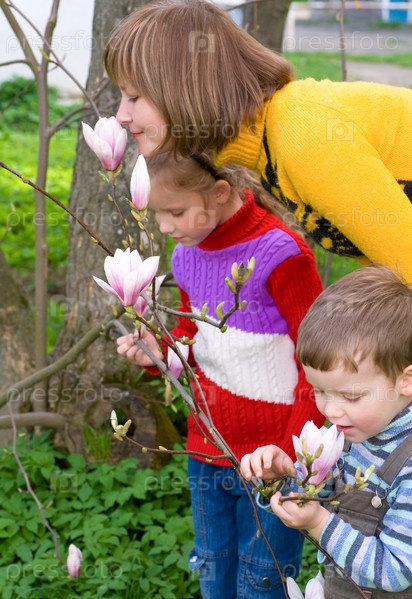 Мать и двое детей у цветущей магнолии в парке