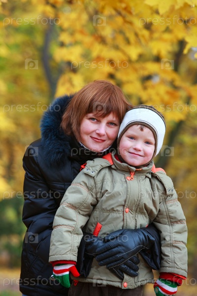 Мать и сын в городском парке осенью
