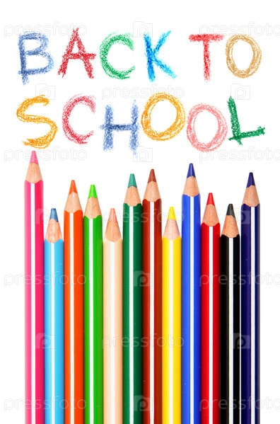 Цветные карандаши и надпись 'Назад в школу' на белом фоне