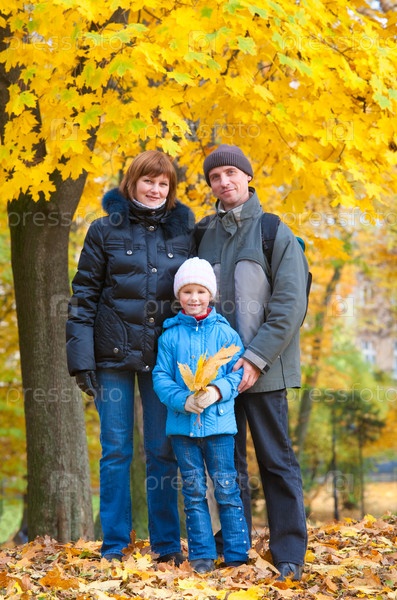Молодая семья в городском парке осенью