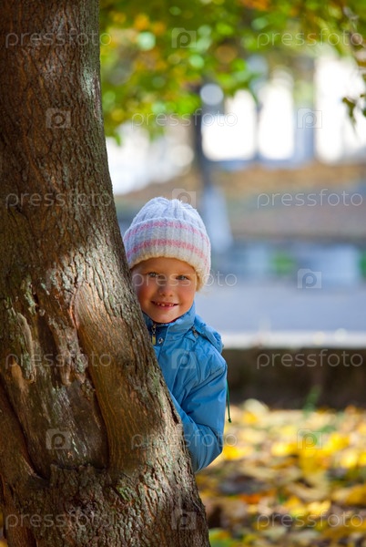 Девочка выглядывает из-за дерева в осеннем парке