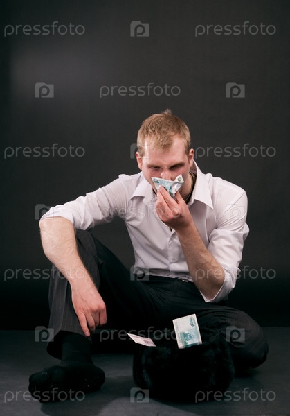 Портрет бродяги, которому бросают деньги, на черном фоне
