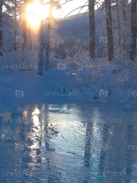 Зимний хвойный лес отражается в реке