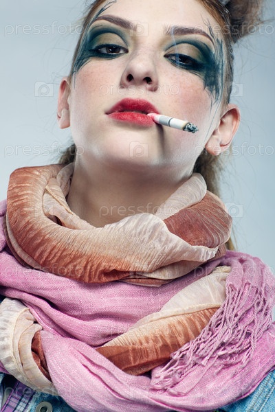 Рыжеволосая девушка-панк с сигаретой на сером фоне